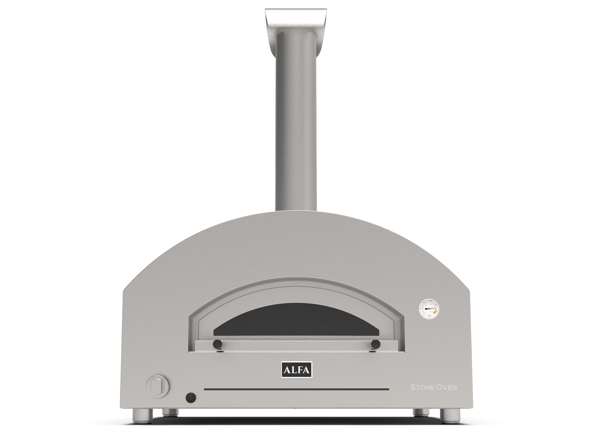 Der 4-Pizze aus der Futuro-Linie ist serienmäßig mit Gasbefeuerung ausgestattet, wobei die kulinarischen Möglichkeiten auch verdoppelt werden können, indem er mit dem Kit Hybrid von Alfa in einen Holzbackofen verwandelt wird.