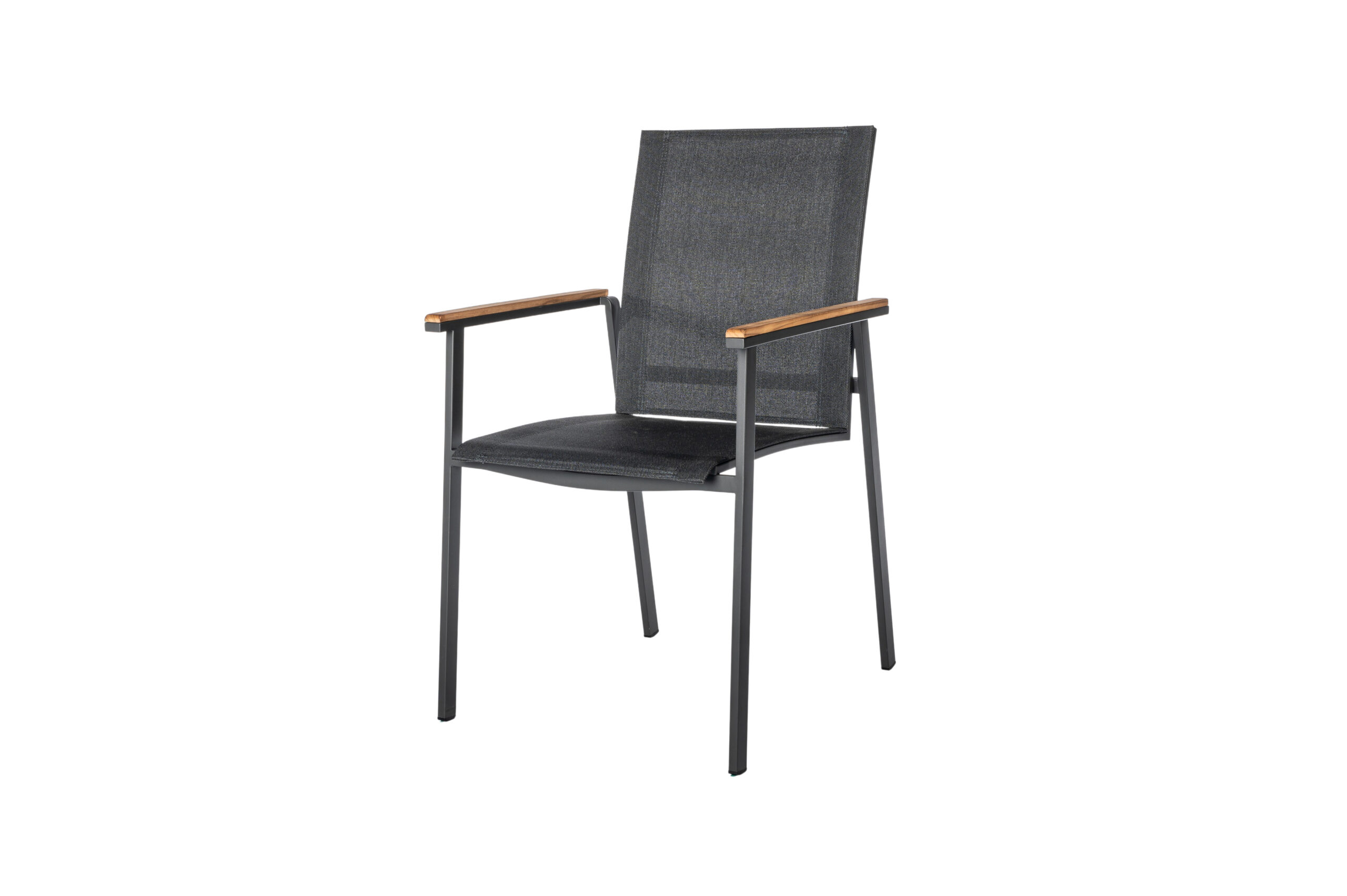 Hochwertiger Edelstahl/304-Rahmen pulverbeschichtet kombiniert mit Batyline®-Textilenegewebe sowie Armlehnen aus Premium Teak.
