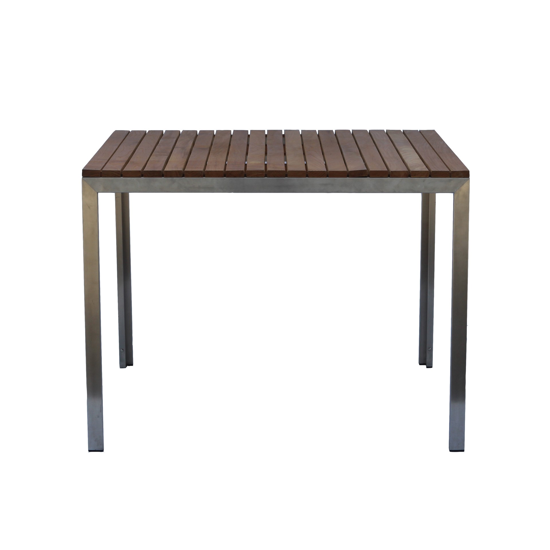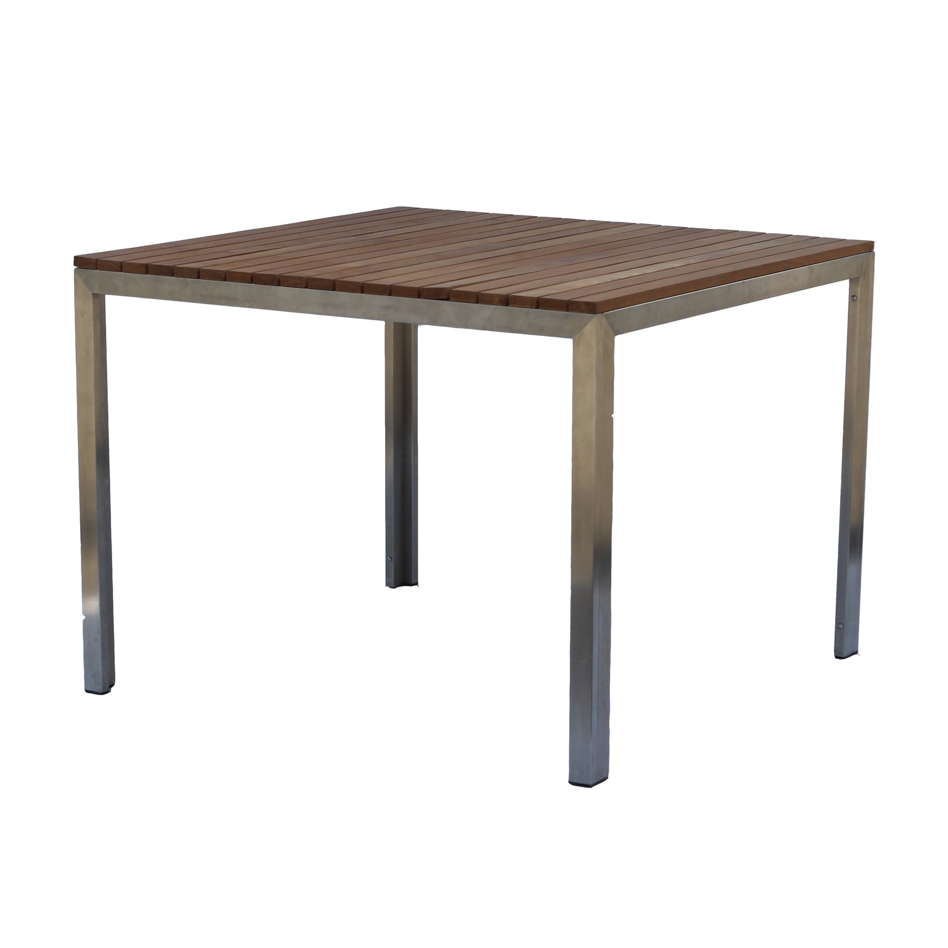 Der Tisch ist aus Edelstahl und mit Echtholz Teaklatten verschraubt.