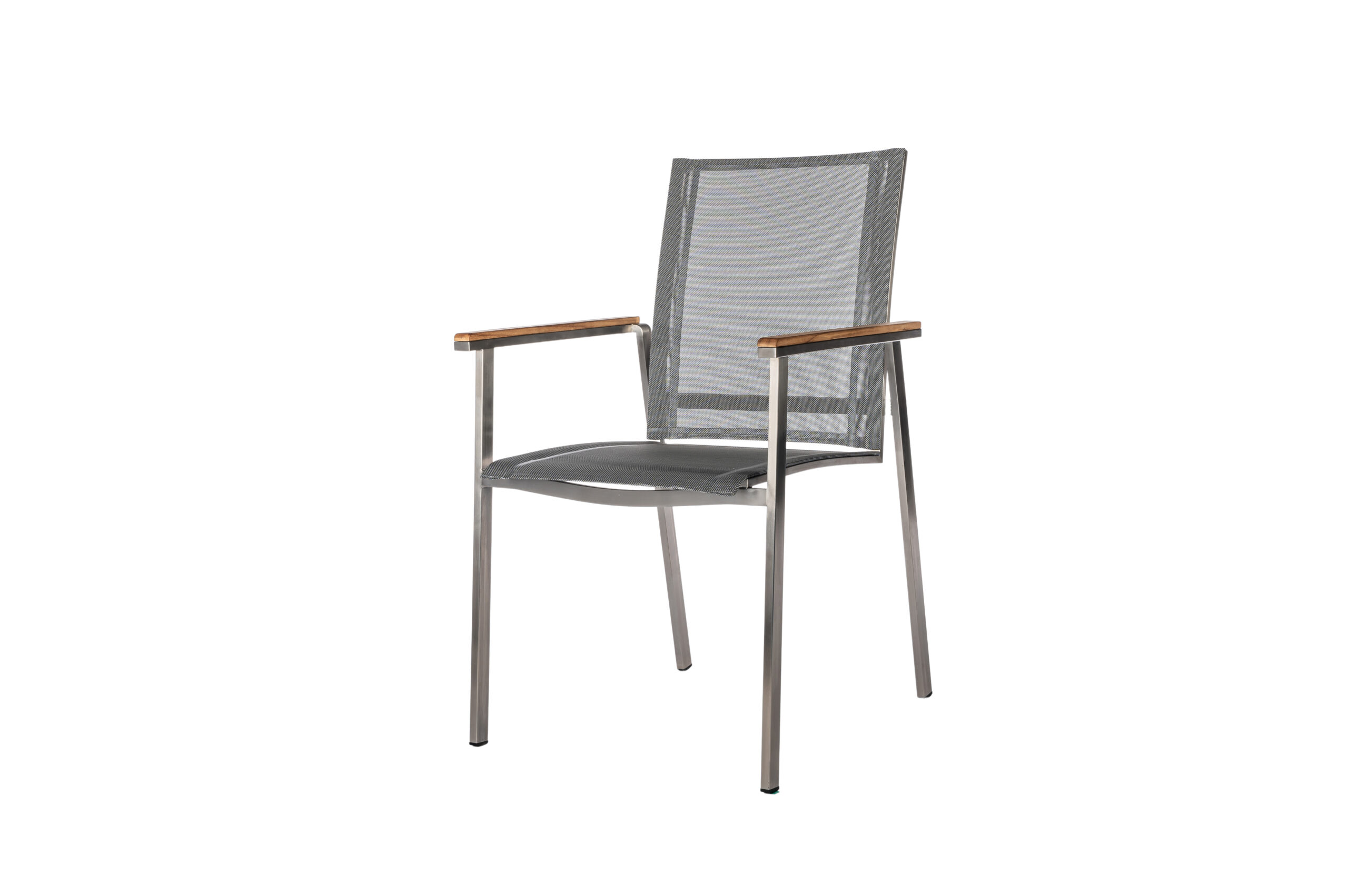 Hochwertiger Edelstahl/304-Rahmen kombiniert mit Batyline®-Textilenegewebe sowie Armlehnen aus Premium Teak.